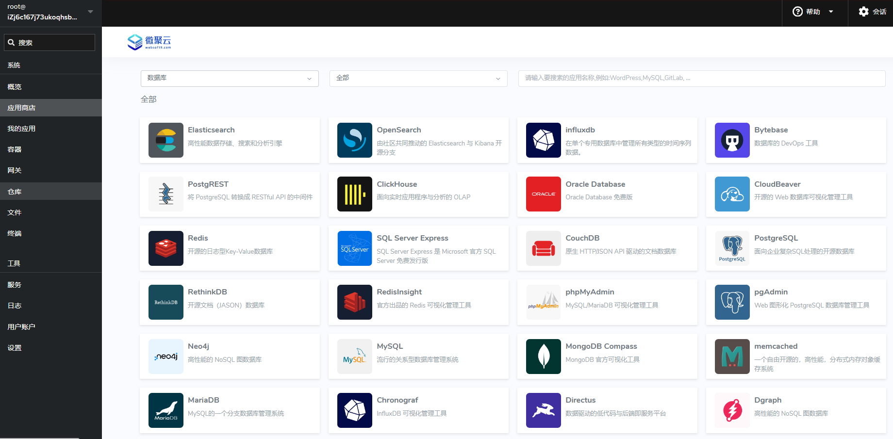 1. 登录 Websoft9 控制台,进入 应用商店 下的 数据库,列出所支持的数据库