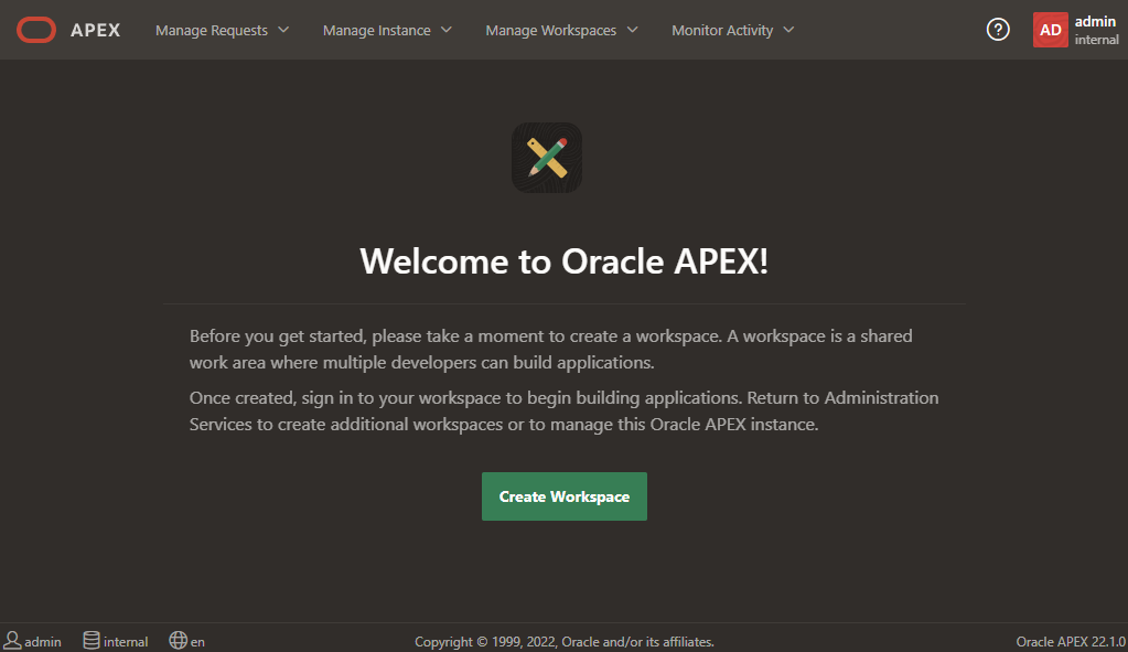 Although APEX includes a default workspace named "internal," it is intended only for administrative purposes.
